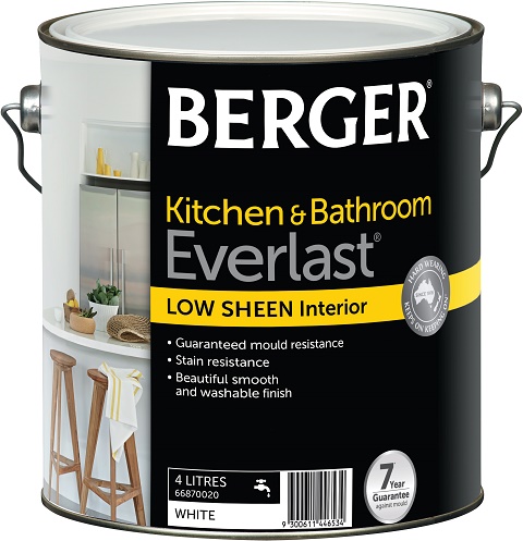 Berger Premium Kitchen & Bathroom Low Sheen Acrylic is specially formulated to provide protection against mould for those areas subject to steam and condensation. It is particularly suitable for wet areas such as bathrooms, kitchens and laundries. Berger Premium Kitchen and Bathroom Low Sheen Acrylic paint is guaranteed to resist mould growth for up to 5 years when used in accordance with the label directions. It's a water based acrylic paint so it's easy to clean up afterwards.